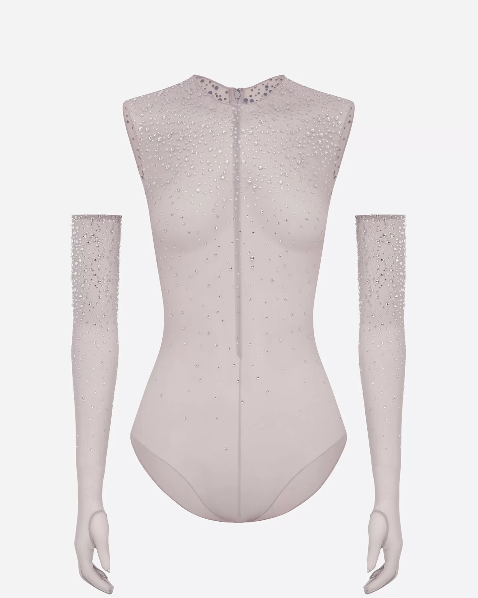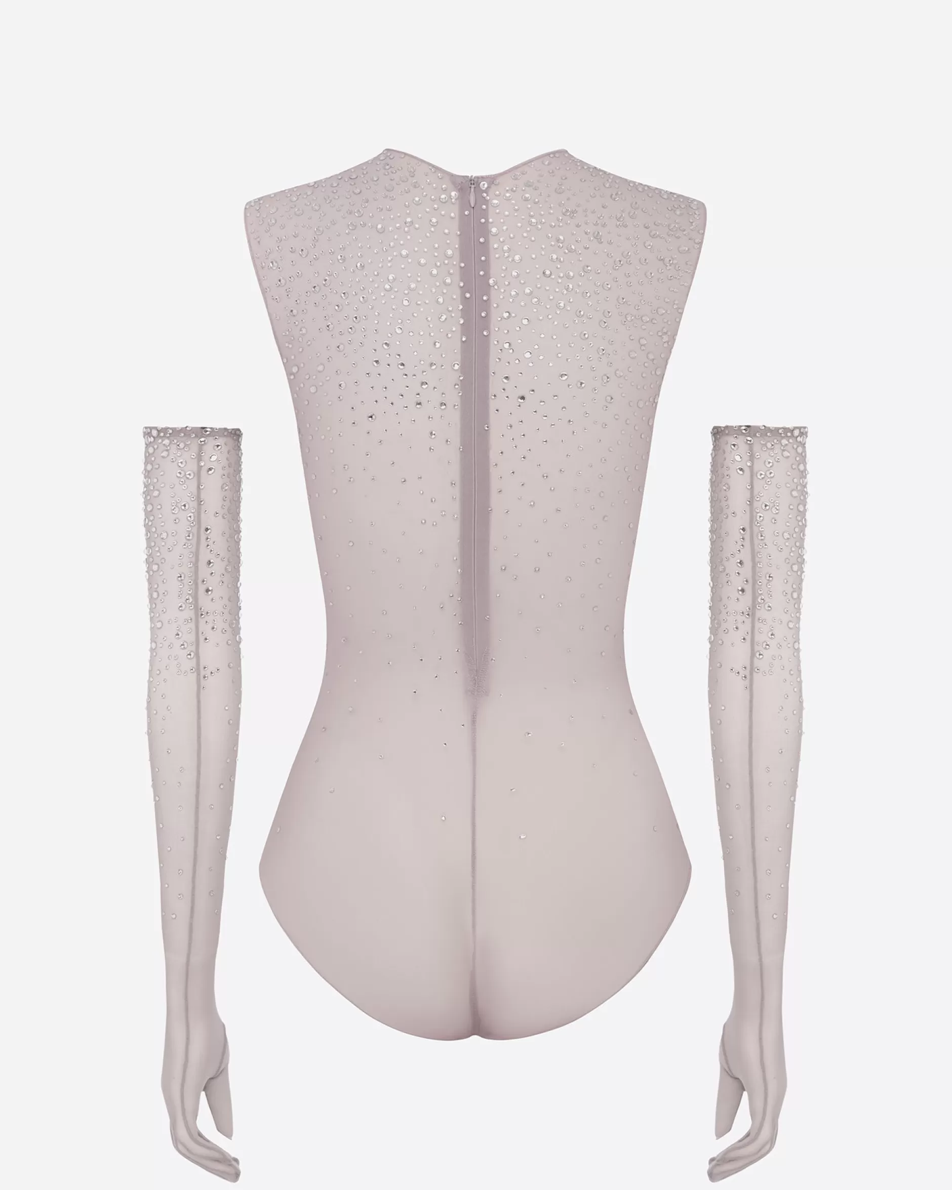 Sleeveless bodysuit in transparent fine mesh with crystals studded from the neck down. Worn with or without gloves.